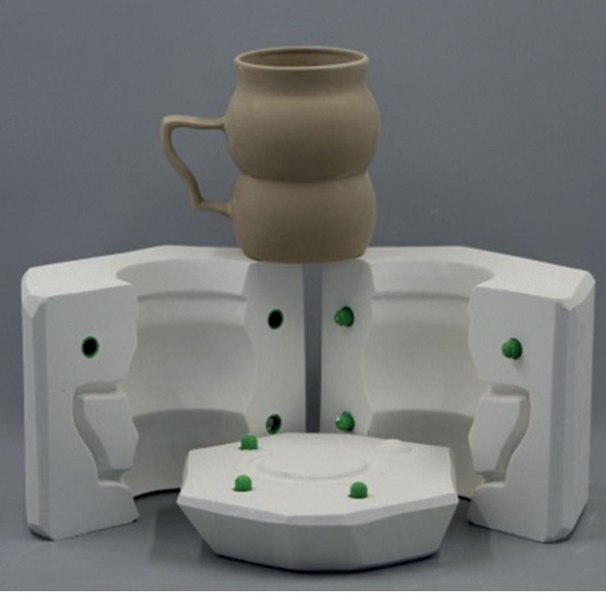 Forma gipsowa kubka w kształcie dwóch brzuszków z ciekawym uchem w kształcie skrzydła.